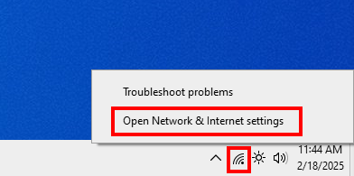 - Right-click the Internet icon on the right side of the taskbar and select "Open Network & Internet settings" from the drop-down.