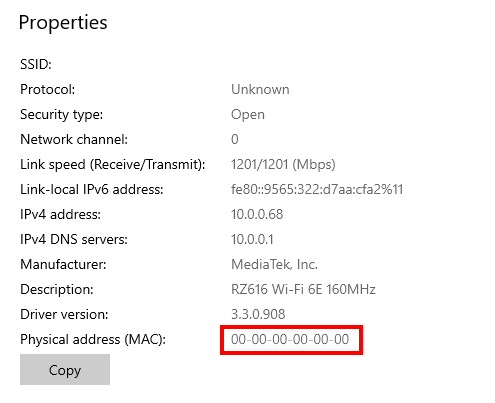 - Your MAC address will be listed under "Physical address (MAC)" at the bottom of the page.