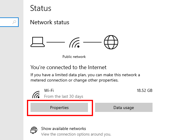 - Click the Properties button under your network's status and data usage.