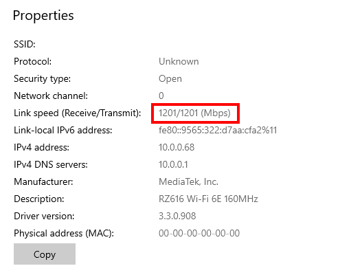 - Your link speed will be listed under "PHY Speed (Mbps)."