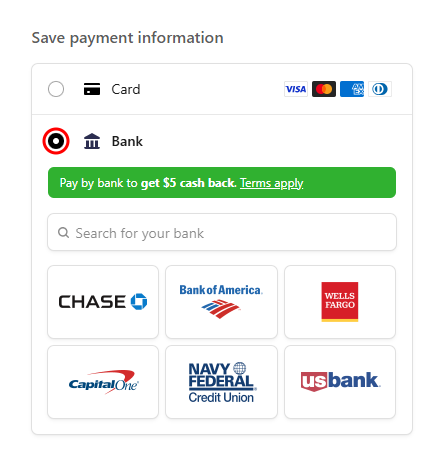 - Under "Save payment information," select Bank and login to your bank of choice. If you don't see a button for your respective bank, you can check the full list of options with the search bar.